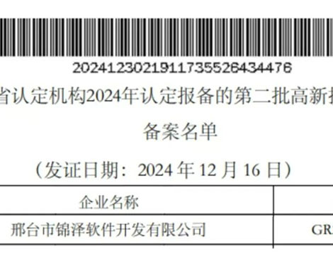 喜報丨熱烈祝賀邢臺市錦澤軟件開發有限公司獲評2024年度“國家高新技術企業”認定